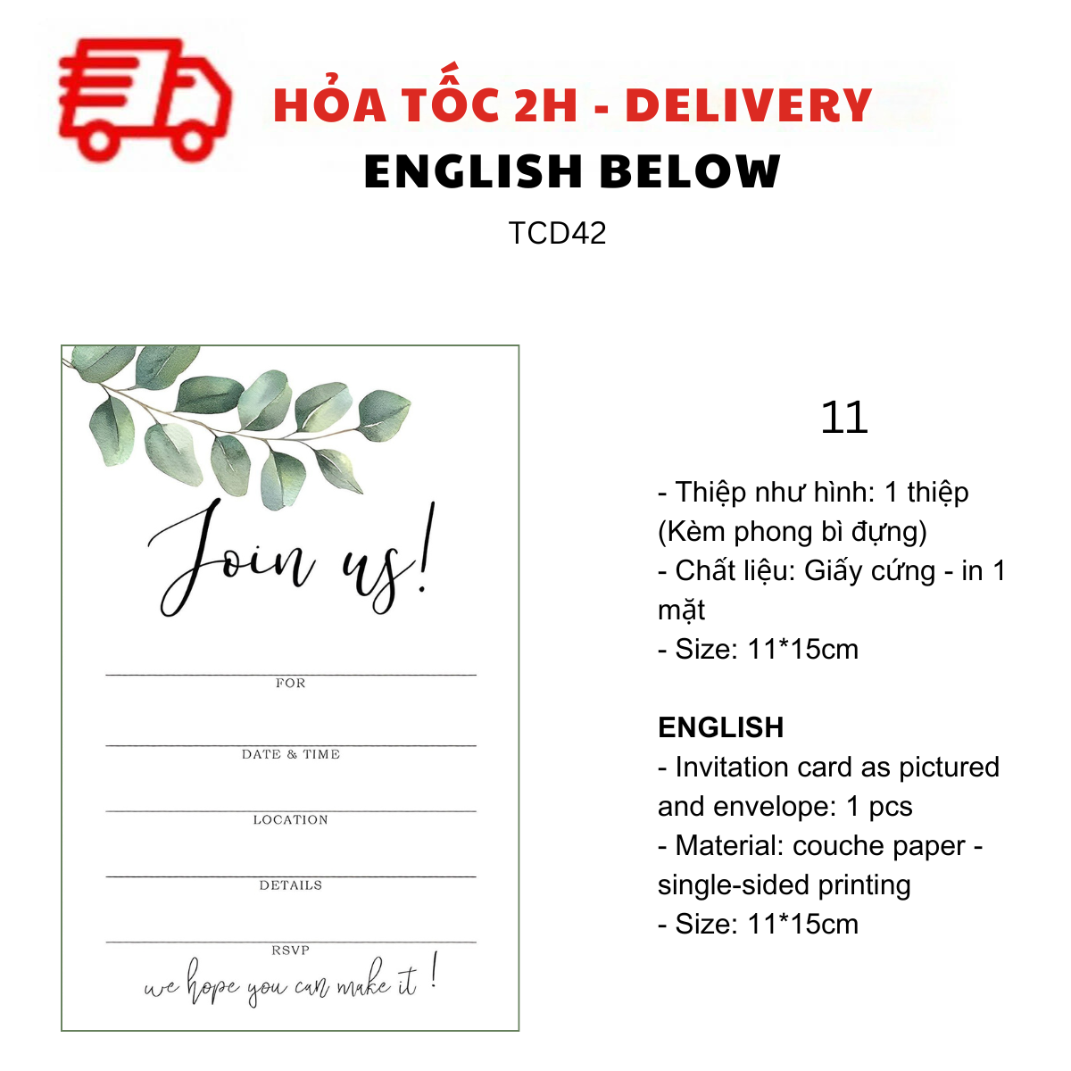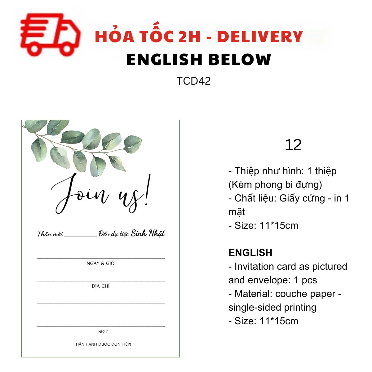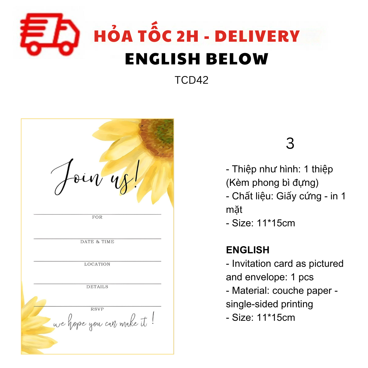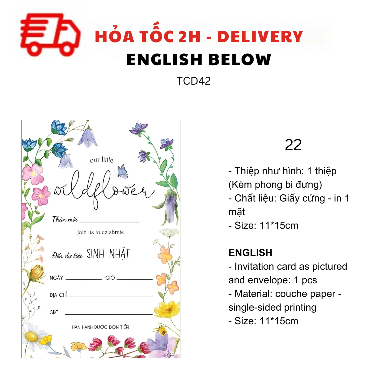 - Thiệp như hình: 1 thiệp (kèm Phong bì đựng)